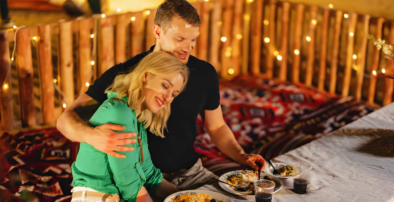 - Descrizione: Inizio della cena sotto le stelle o in una tenda berbera. Il menu include: